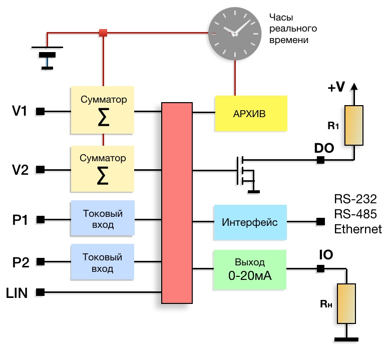 - архивирование часовых, суточных и месячных значений объёмов от подключенных по интерфейсу LIN расходомеров Питерфлоу;